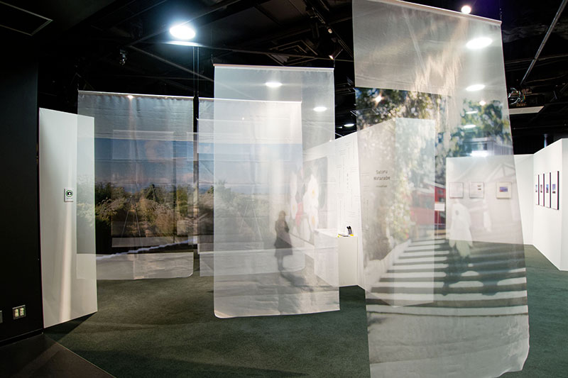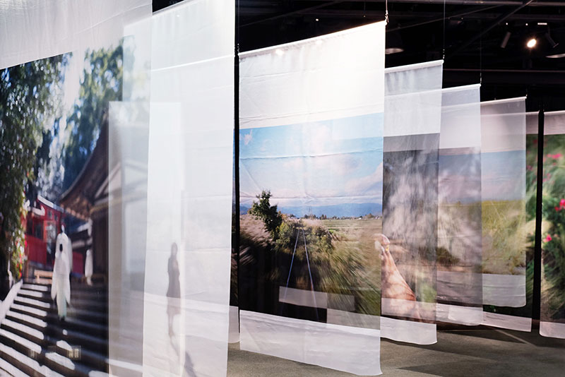 渡部さとる氏は、アウトフォーカスのイメージと言葉を組み合わせ、鑑賞者の感情と対話するような作品を、揺らぎのあるオーガンジー素材を用いて表現します。