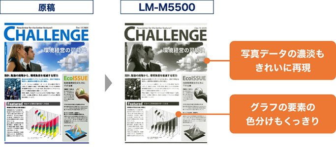 『LM-M5500』は、独自のインクジェット技術によりモノクロでも鮮明に濃淡を表現できるので、写真データや色付きのグラフなども高品質な印刷が可能です。また、細線や小さな文字もはっきりと印刷でき、請求書や契約書といった証憑類も、高い視認性を維持します。モノクロでの印刷が求められる社内向け資料から、お客様にお渡しする書類まであらゆる用途に安心してお使いいただけます。