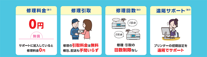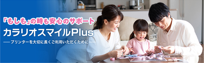 「カラリオスマイルPlus」は修理発生時の修理料金をサポートし、回数制限なく無料で修理引き取りを行います。また、プリンターの初期設定を遠隔でサポートします。