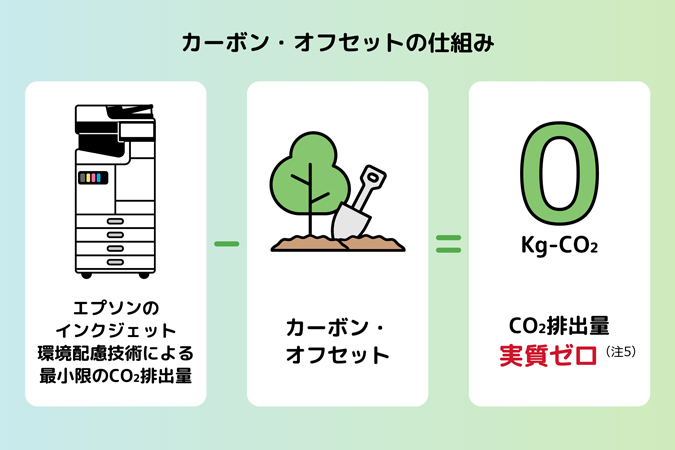 「エプソンのスマートチャージ」は、インクジェット技術によりレーザープリンターと比べて低消費電力・省資源化を実現し、CO2排出量を47%以上(注4)削減することができ、脱炭素社会に向けた取り組みへの第一歩として、その導入そのものが有効な手段となっています。今回ご提供する『カーボン・オフセットサービス』を活用することで、お客様が「エプソンのスマートチャージ」を使用することによるCO2排出量は実質ゼロ(注5)となり、導入企業における脱炭素化をさらに支援します。