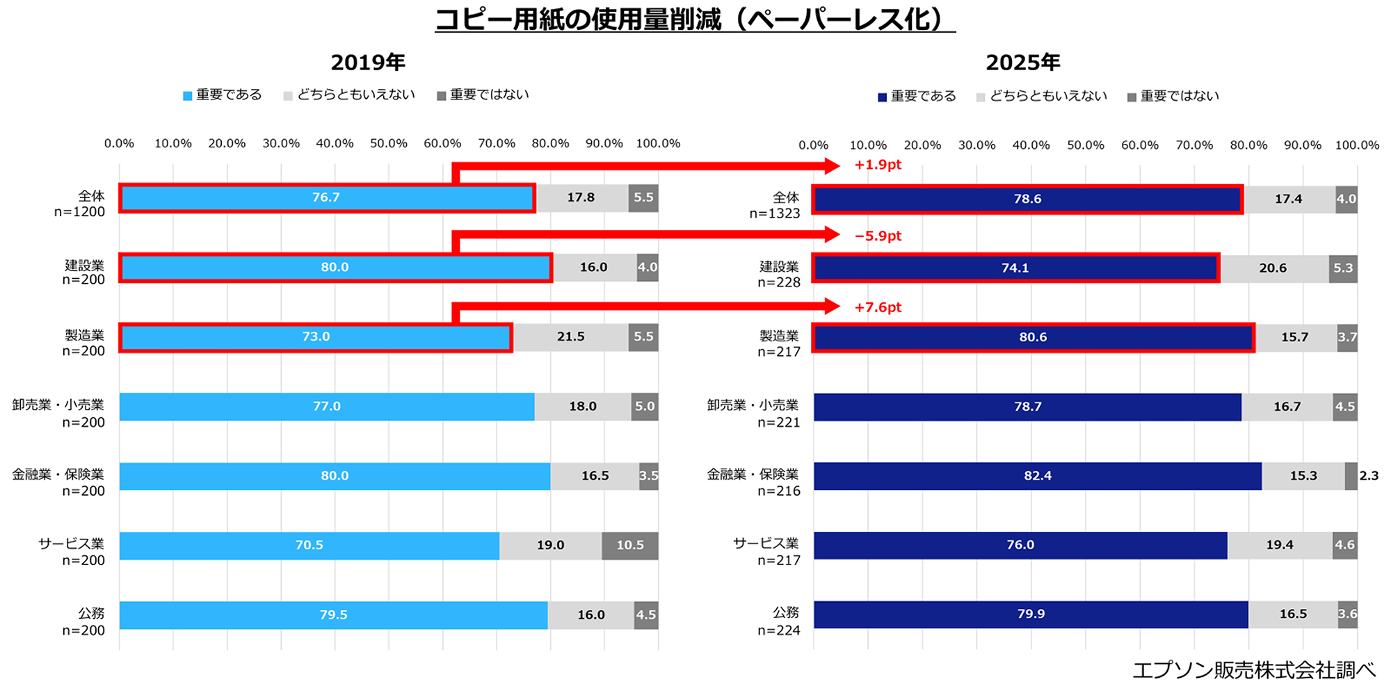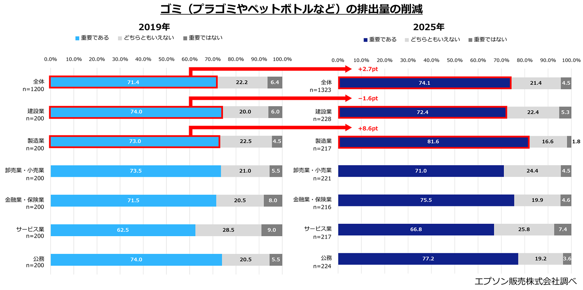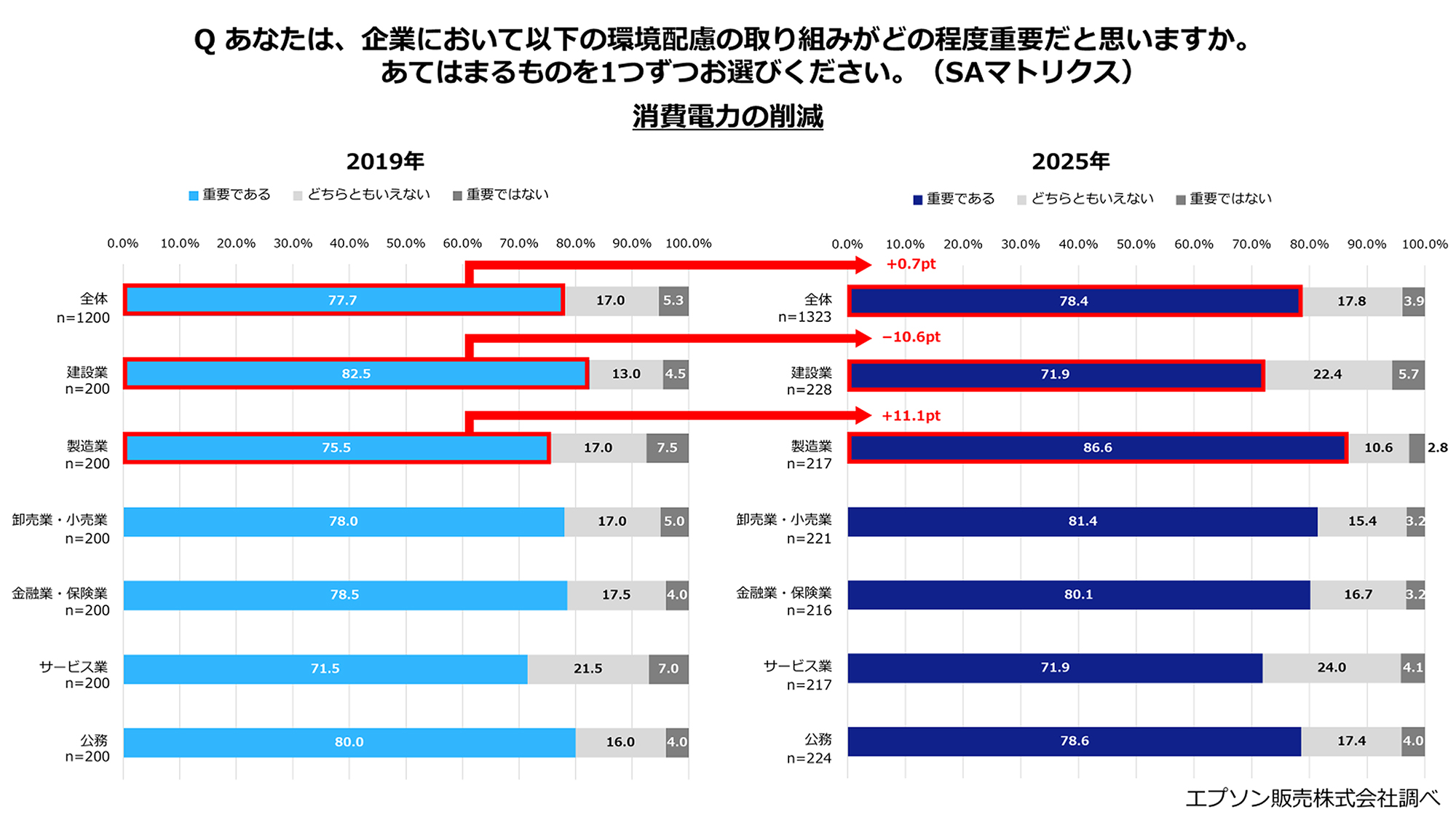 業種別で見ると、製造業は「重要である」「やや重要である」と回答した人の合計が全ての項目で8割を超え、2019年の調査からそれぞれの割合が増加しています。一方、建設業は2019年の調査と比較すると、「消費電力の削減」が71.9%と2019年の82.5%から−10.6ptと最も減少しており、その他の項目を見ても重要だと回答した人の割合が減少しています。全体的に環境配慮の重要性は2019年より高まっている一方で、建設業のみ全ての項目の重要度が低下していることが明らかになりました。