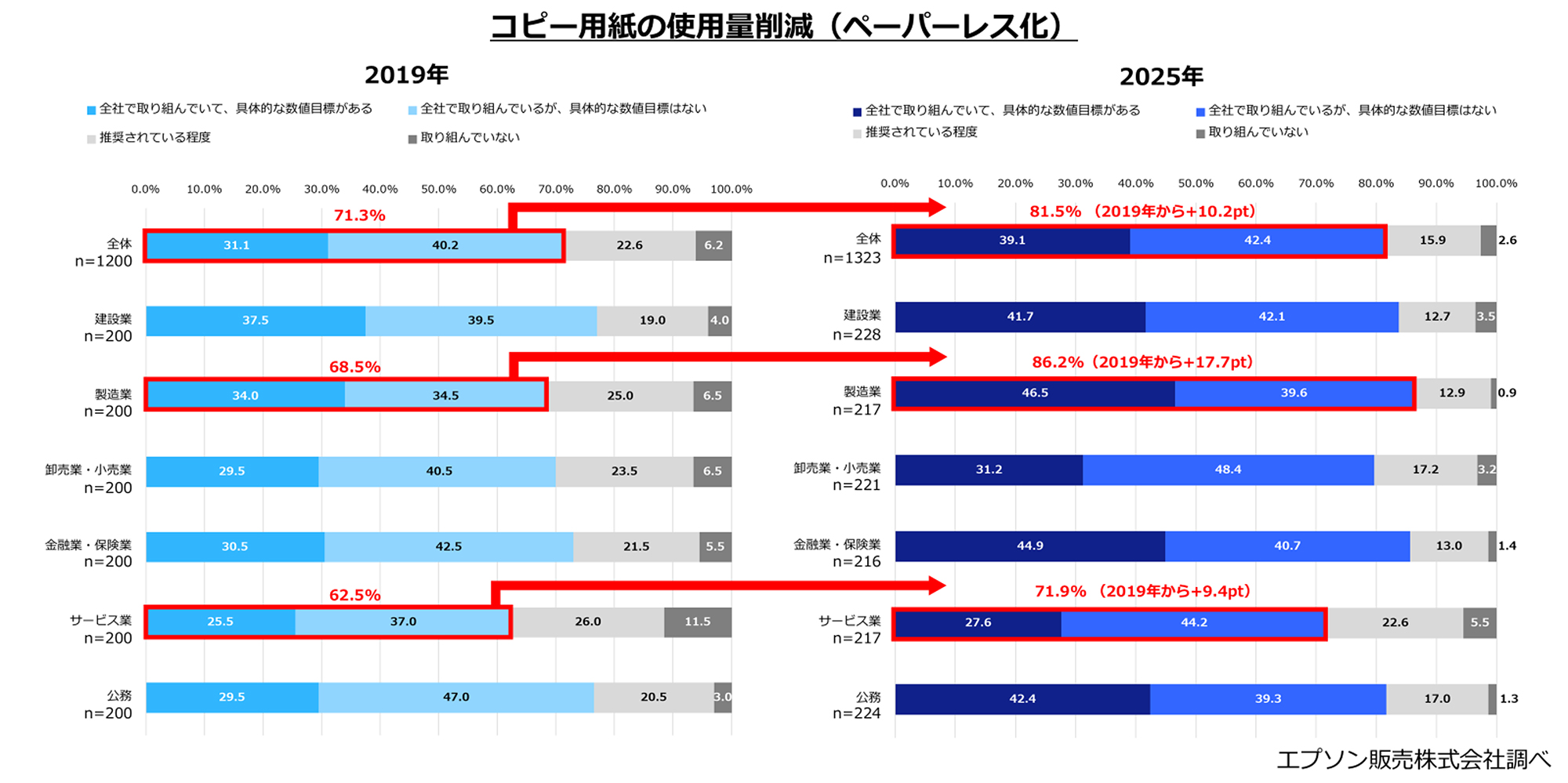 また、各取り組みの状況について、「全社で取り組んでいて、具体的な数値目標がある」もしくは「全社で取り組んでいるが、具体的な数値目標はない」と回答した人の合計は、全項目で2019年の調査より増加しました。「消費電力の削減」は79.1%と、2019年の74.0%から+5.1pt、「ゴミ(プラゴミやペットボトルなど)の排出量の削減」は70.2%と、2019年の63.2%から+7.0pt、「コピー用紙の使用量削減(ペーパーレス化)」は81.5%と、2019年の71.3%から+10.2ptとなりました。