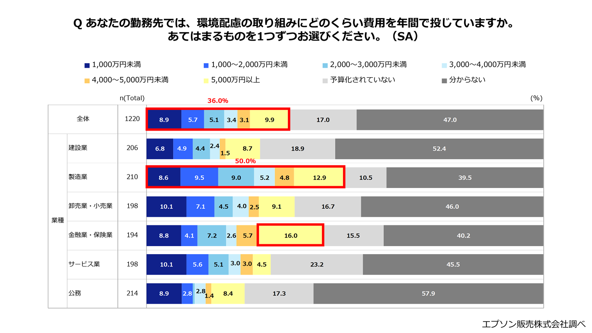 環境配慮の取り組みに年間で費用を投じている企業は全体で36.0%と、4割弱が環境配慮の取り組みに予算を確保できていることが分かりました。業種別で見ると、環境配慮の取り組みに費用を投じていると回答した割合が最も高い業種は製造業(50.0%)で、「5,000万円以上」と回答した割合が最も高い業種は金融業・保険業(16.0%)となりました。一方で、全体で17.0%は「予算化されていない」と回答し、一定数の企業が環境配慮の取り組みに予算を確保できていないという状況も明らかになりました。