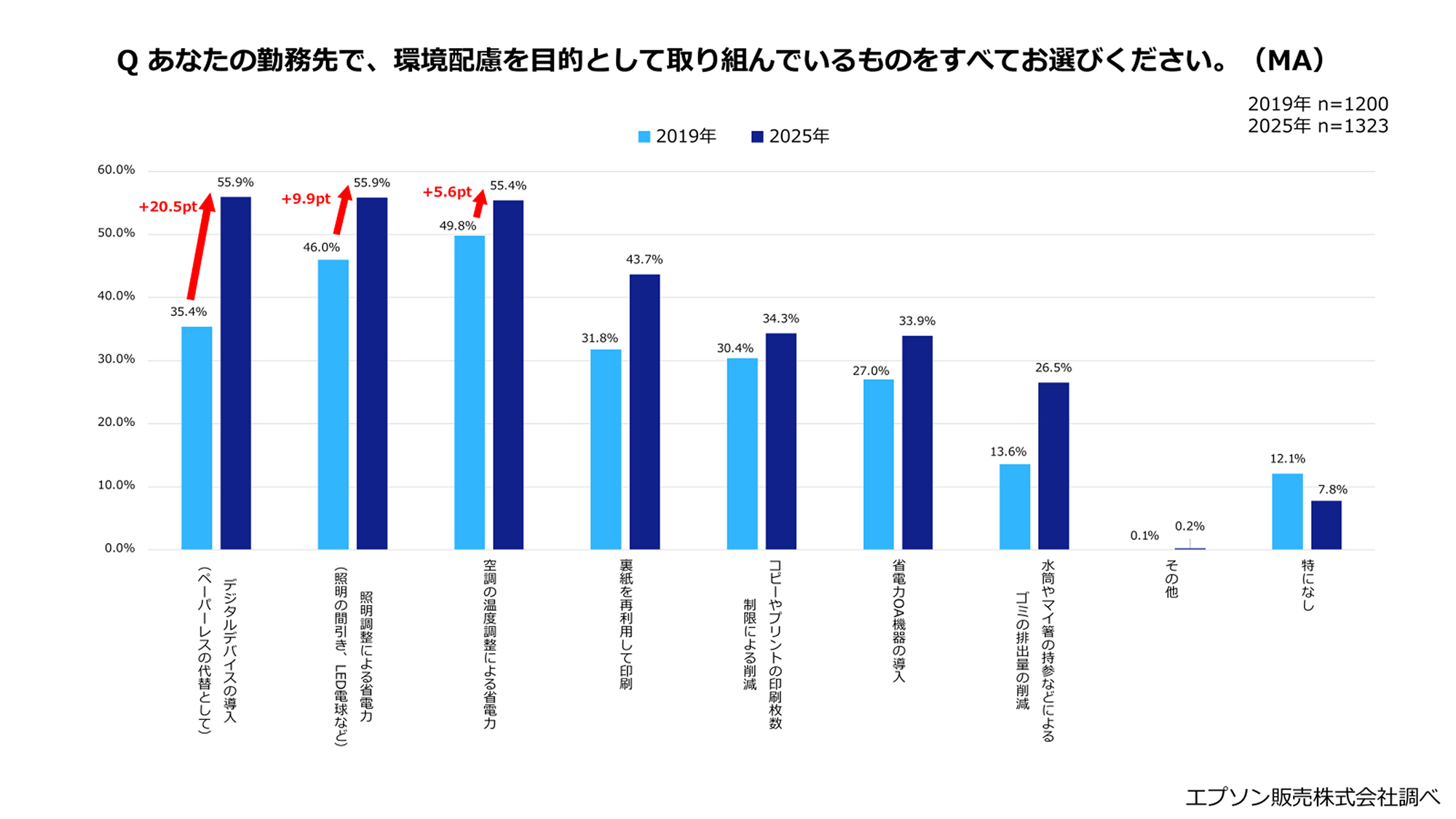 エプソン販売株式会社は、従業員数500人以上の企業に勤務する会社員(CSR・SDGs・オフィス環境改善・経営企画・オフィス機器調達などの実務・意思決定に関わる方)および公務員の計1,323名を対象に、「2025年版 ビジネスパーソンの職場における環境問題に関する意識と実態調査」を実施しました。