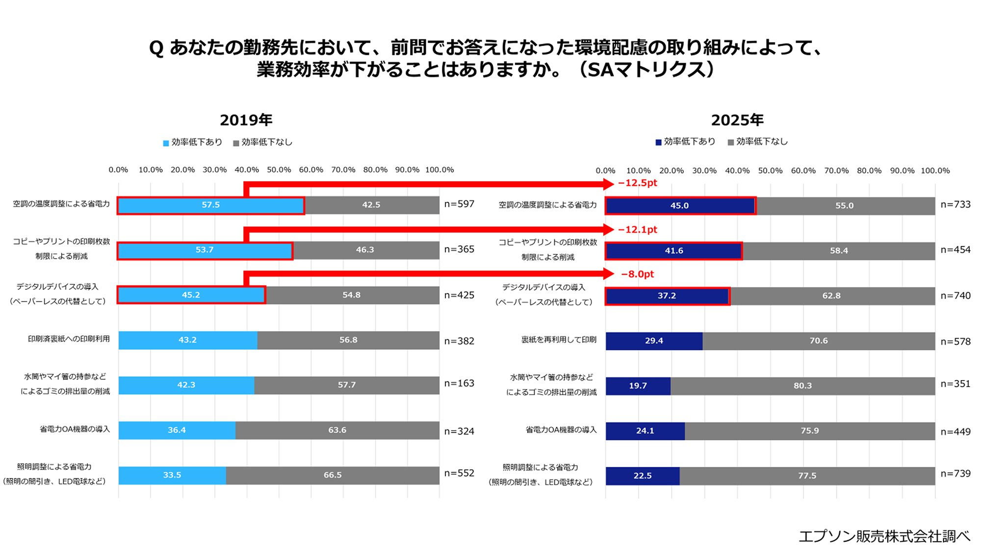 また、環境配慮の取り組みによる業務効率への影響について、「効率が下がる」との回答は全体的に減少傾向でした。「効率が下がることがよくある」「効率が下がることがたまにある」との回答の合計が高かった項目は、「空調の温度調整による省電力(45.0%)」「コピーやプリントの印刷枚数制限による削減(41.6%)」「デジタルデバイスの導入(ペーパーレスの代替として)(37.2%)」。2019年の調査と比較すると、業務効率が下がるという回答の割合は全ての項目で減少しており、環境配慮と業務効率の両立がより実現できるようになっていると推察されます。