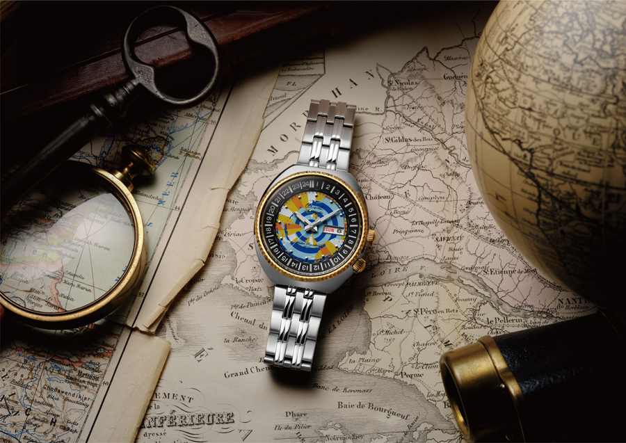 レトロ感あふれる『ワールドマップ』は、まさにオリエントの歴史と時代を語るモデルのひとつです。原型となったのは1969年発売の『ワールドダイバー(注1)』。この時計は日本人の海外渡航が自由化された1964年に発売された伝説の希少モデル『カレンダーオートオリエント スイマー ワールドトリップ(注1)』の後継機として考案され、ダイバーズウォッチとトラベルウォッチの特長をオリエントならではのユニークなスタイルで表現したものでした。ケース4時位置のりゅうずで操作する24時間表示内転リングを文字板に描かれた南半球から見た世界地図に合わせることで各地のおおよその時刻が把握できる簡易ワールドタイム機能には、海外旅行への憧れが象徴されていました。