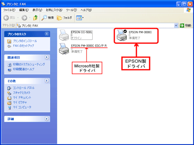 ([プリンタとFAX]で、機種名の後に「ESC/P R」とあるのがMicrosoft社製プリンタドライバです。)