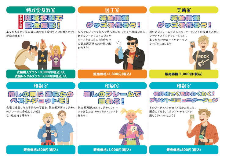 レシートプリンターを搭載した「レシート写真機」にて写真撮影を行い、印刷された用紙に応援メッセージを書き、掲示板に貼り付けるコーナー。皆様に書いていただいたメッセージは、その後氣志團のメンバーにも届けられました。また、レシート写真機は氣志團万博2025に出演したアーティストの楽屋にも設置。アーティストの皆様にも撮影を楽しんでいただきました。