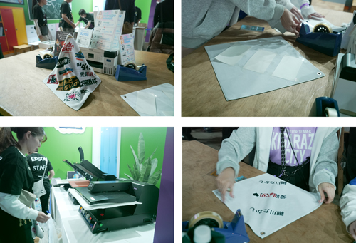 好きなアーティストのロゴを自由にレイアウトしたタオルが制作できる体験。お客様は、アーティストのロゴを印刷した専用用紙(昇華転写プリンター「SC-F150」で印刷)をタオルに貼り付けます。その後、スタッフがヒートプレス機でタオルに圧力と熱を加えることで、ロゴがタオルに転写される仕組みです。体験したお客様からは、「世界に1つだけのグッズを作れてよかった」、「思ったより簡単にできて驚いた」といった声をいただけました。