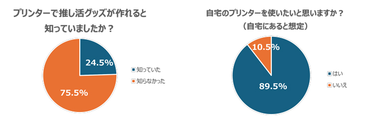 来場者への聞き取り調査(注1)では、ブース全体を通じ多数のポジティブな意見が寄せられました。一方で、ご家庭のプリンターで推し活グッズを作成できると知っていた方は、全体の24.5%にとどまることが判明。まだまだ推し活用途でのプリンター活用が知られていませんでした。しかし、今回の体験を機に、自宅のプリンターを使いたい(グッズを制作してみたい)という方が89.5%を占めました。推し活とプリントの相性の良さ、手軽さを実感いただけたことがわかりました。