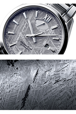 この鉄隕石のもつ美しい結晶構造を保つために、銀色蒸着処理(防錆薄膜コーティング)を施しています。銀色蒸着処理を施したオリエントスターのメテオライト文字板は1点ずつ結晶の模様が異なり、それぞれが唯一無二の個性を持っています。SARコーティング(両面無反射)を施し、99%の透過率を実現した両球面サファイアクリスタルを通じて希少なメテオライト(隕石)を鮮明に鑑賞でき、しかも個々の模様の違いから生まれる特別感は、一般的な量産モデルでは決して味わえません。