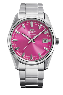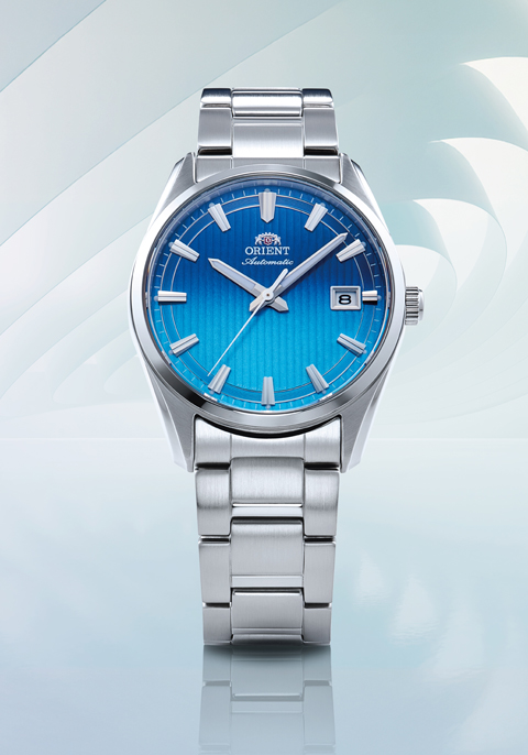 中3針で日付表示が備わる直径38.5mmの『オリエントストレット デイト』は、ベーシックなカラーを採用するこれまでとは一変して、ポップ&メタリックをテーマにした5種類の鮮やかなカラーが取り入れられています。円弧を描く放射仕上げを施し、高層ビルを思わせる立体的な楔型インデックスを配した『オリエントストレット』の特長的な文字板は、26年春夏シーズン限定モデル4種類ではグリーン、ブルー、ピンク、オレンジで彩られ、弾けるような色彩がインパクトを放ちます。そして2,300本の数量限定(国内300本・海外2,000本)モデルの文字板は、型押しのストライプ模様と上下のブルーグラデーションを組み合わせた特別なデザインに仕上げられています。