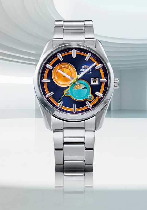 26年春夏シーズン限定モデルとして発売される『オリエントストレット サンアンドムーン』は、『オリエントストレット デイト』の26年春夏シーズン限定モデルの文字板を彩る4色をすべてひとつのダイヤルに取り込む試みが成されています。太陽と月のモチーフで1日の昼夜を示す4時位置のサンアンドムーン表示部はブルー、10時位置の指針式の曜日表示と楔型インデックスの下をくぐる同心円のサークルはオレンジ、アクセントとしてピンクの分目盛、秒針にグリーンというように、実にカラフルな配色が目を奪います。