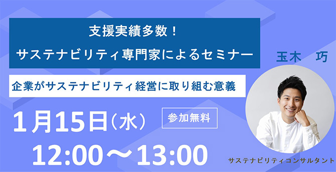 大好評であったコンサルティング企業を再度お招きして、『企業がサステナビリティ経営に取り組む意義』を解説いただきます。サステナビリティの担当になった方は必見のセミナーです。