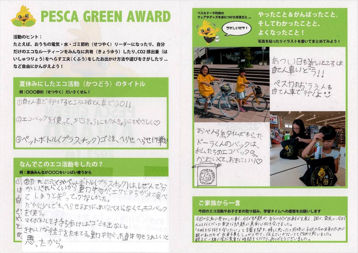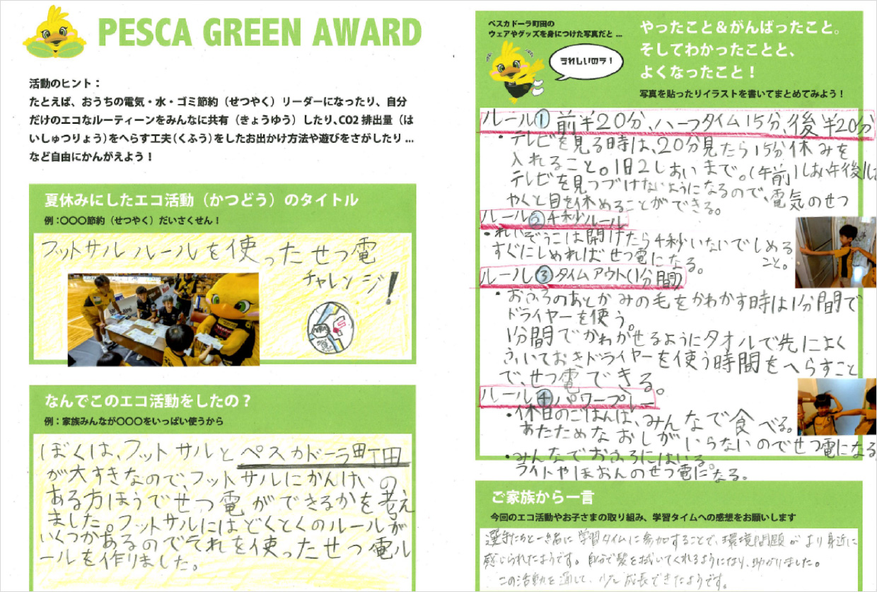 - 子供たちから寄せられたペスカグリーンアワードへの応募作品「フットサルのルールを使った節電チャレンジ」など