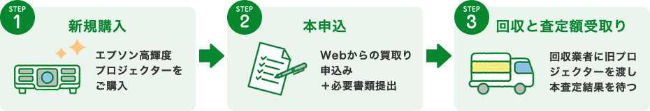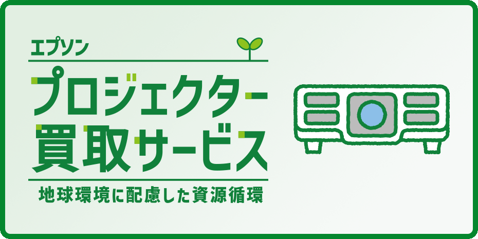 買取サービスは、対象のエプソン製プロジェクターを新規にご購入いただくと、お申し込みが可能なサービスです。メーカー問わず不要となったプロジェクターの査定をしたのち、査定金額についてご連絡差し上げます。お客様のもとで不要になったプロジェクターを買い取り、中古市場で再販することで、商品の長寿命化、廃棄物削減に貢献します。