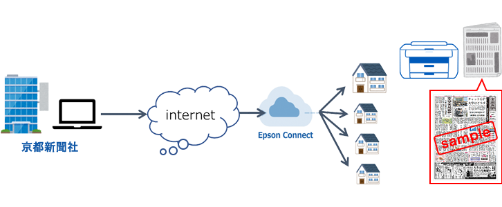実証実験では、購読者宅にA3サイズのエコタンク搭載モデル「PX-S6710T」の貸し出しを行い、エプソンのクラウドサービス「Epson Connect」を使用して、インターネット経由で新聞のデジタルデータを購読者宅のプリンターに送信します。指定の時間に自動で紙へ印刷されるので、購読者は何もしなくても、ファクスのように新聞の情報を受け取ることができ、A3サイズで、しかもカラーで印刷されるので文字も鮮明に読むことができます。