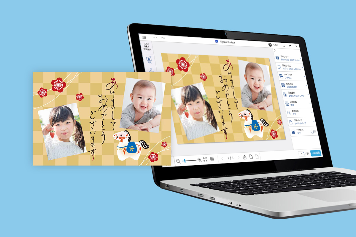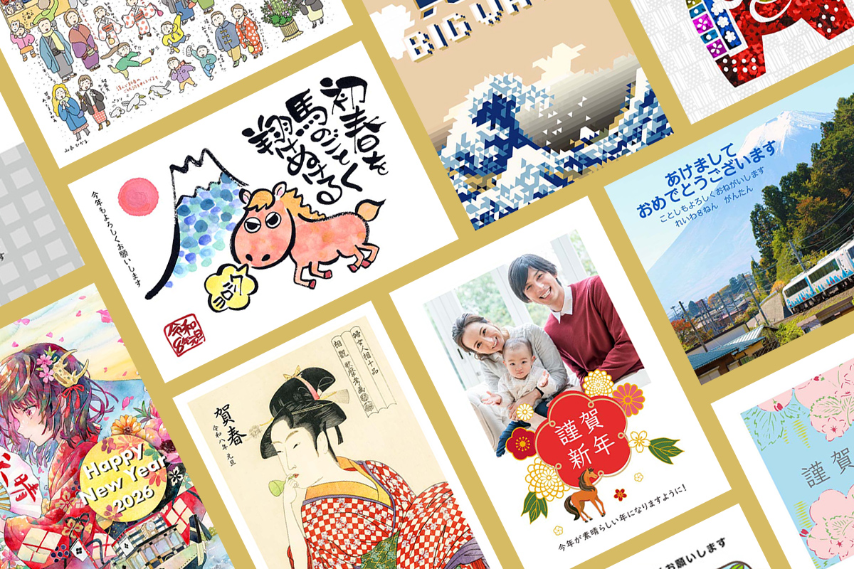 2026年の干支、午(うま)のデザインをはじめ、ビジネスでも使えるシンプルな年賀状から、おしゃれなデザインまで、エプソンだけのオリジナルのデザイン素材を多数ご用意!