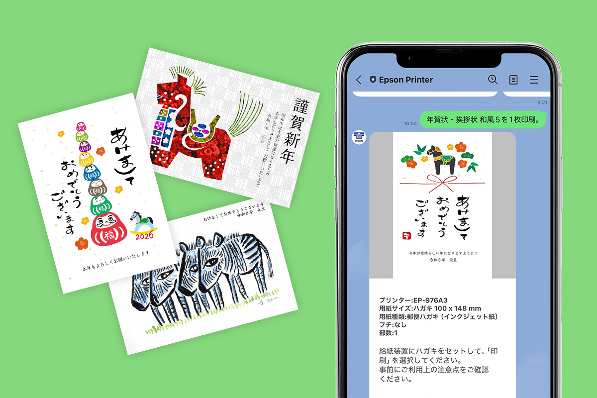 LINEアプリで「Epson Printer」をお友達追加すると、全269種類のデザインから、自分の好きな年賀状やポストカードを簡単に印刷できます!