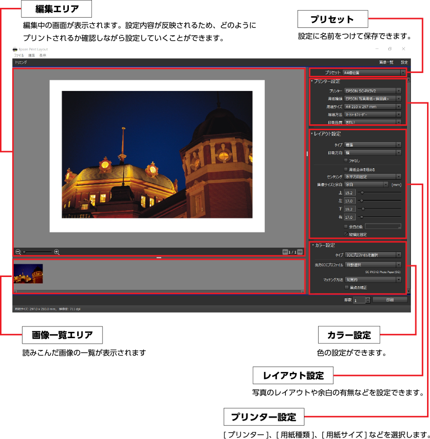 「Epson Print Layout」は、(1)余白の調整ができる。(2)プリント時の色に関する設定(カラーマネジメント)をミスなく行える。(3)プリントの設定をプリセットで保存できる。のが大きな特長です。