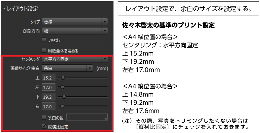 私の場合、(1)用紙は、写真用紙<絹目調>、(2)サイズは、A4サイズ、(3)カラー設定は、用紙のプロファイルを使ってプリント、(4)余白は、横位置写真では、左右17mm、上15.2mm、下19.2mmで設定しています。