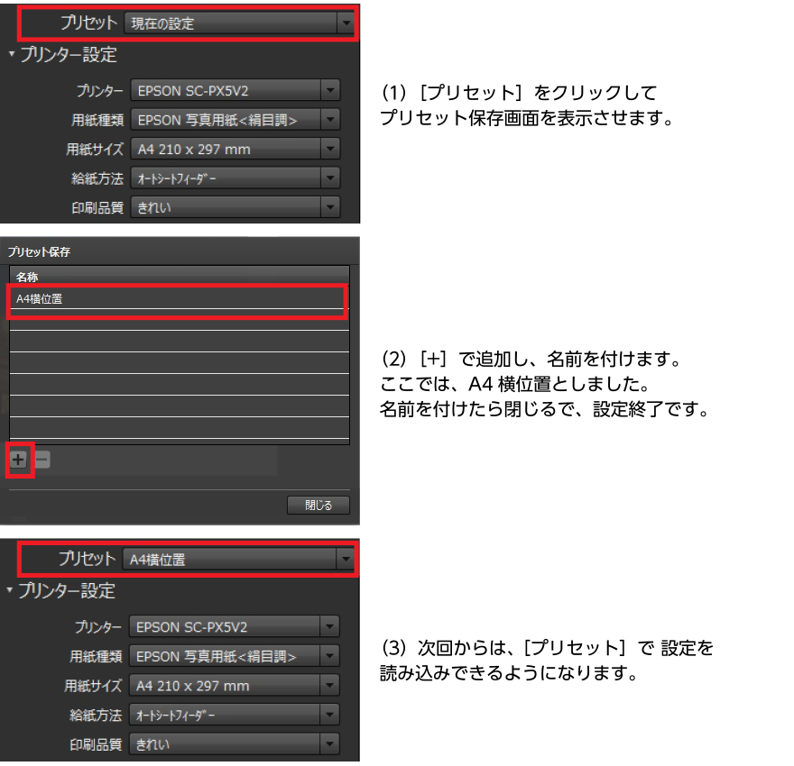 自分のプリント設定をプリセット保存しておけば、毎回素早く同じ設定にできるので、基準のプリントづくりには、大変便利です。