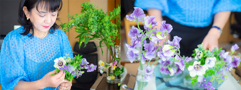 フラワーアレンジメントの技術は本場のロンドンで習得。その腕前で、被写体となるブーケを次々と作っていく
