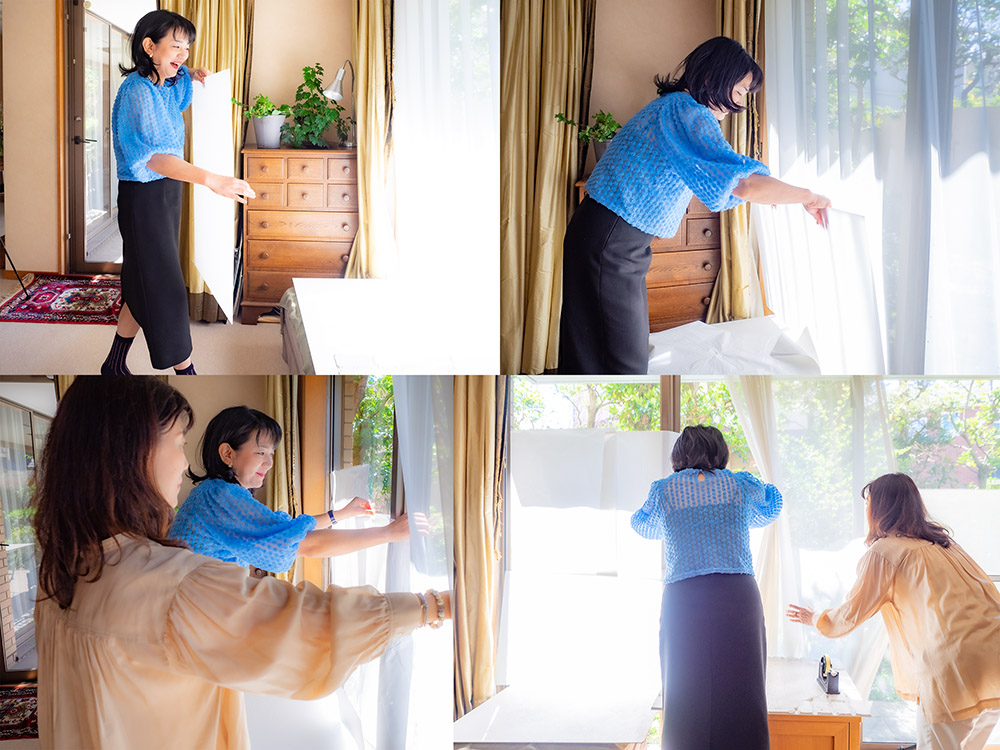 乳白色のアクリル板を持ち出すと、それを窓辺に配置。参加者の谷津さんも加わり、窓に乳白色のシートなどを貼り付けて撮影スペースに作り替えていく