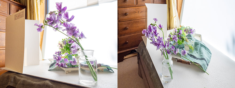 窓辺に作った撮影スペースに被写体を配置。照明は自然光のみで、それを弱める(陰を柔らかくする)ための乳白色のディフューザーと、光を反射するレフ板(ここでは白い厚紙を折ったものを使用)で構成。手前に置いた背の高い花は前ぼけの素材となる