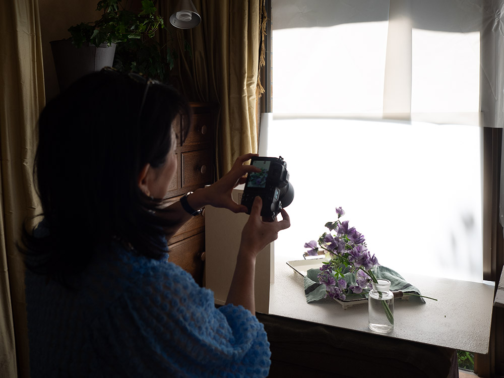 今道:花の写真は自然光です。乳白色のアクリル板やプラダン、半透明のビニール袋などを使えば光が柔らかくなるし、花の後ろの白い背景が抜けるので。