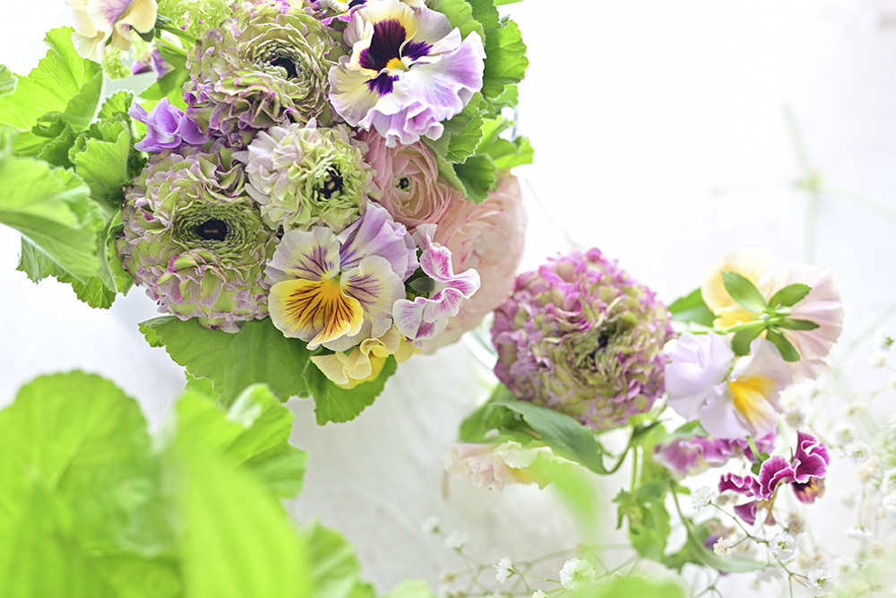 今回は、最初の撮影用としてアネモネとラケナリア、次の被写体としてパンジーを主役にしたブーケを作りました。