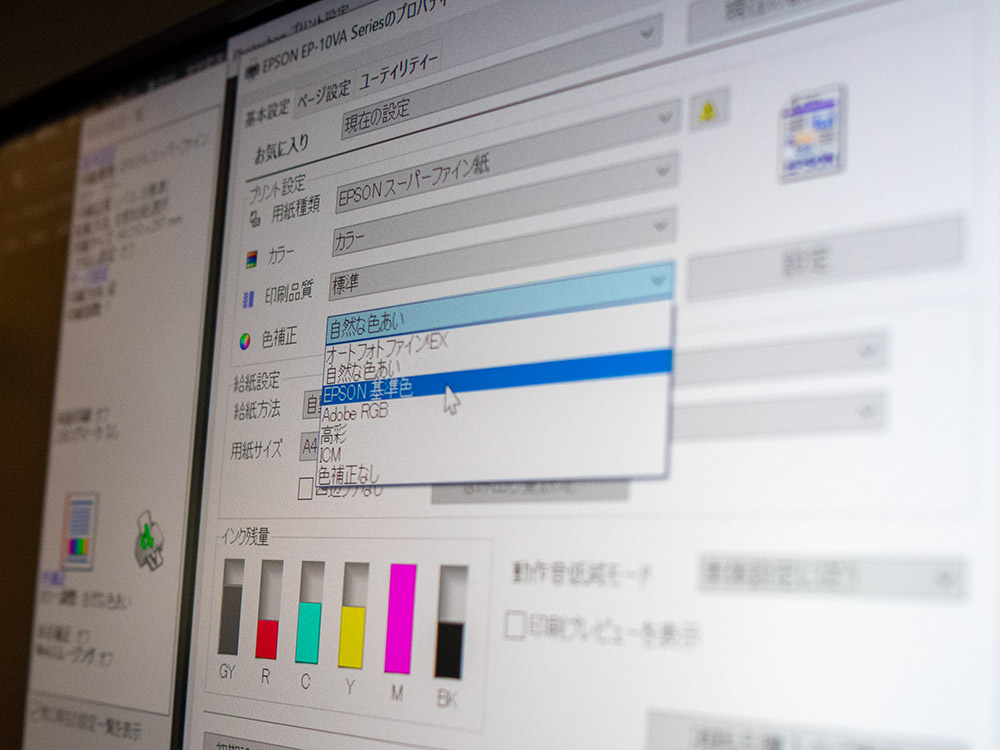 今道:「EP-10VA」の初期設定は「EPSON基準色」ではなく、「自然な色合い」になってました。それを「EPSON基準色」に変えてあげると、モニターで見たものと、できるだけ近くに変換するっていう色補正方法になります。