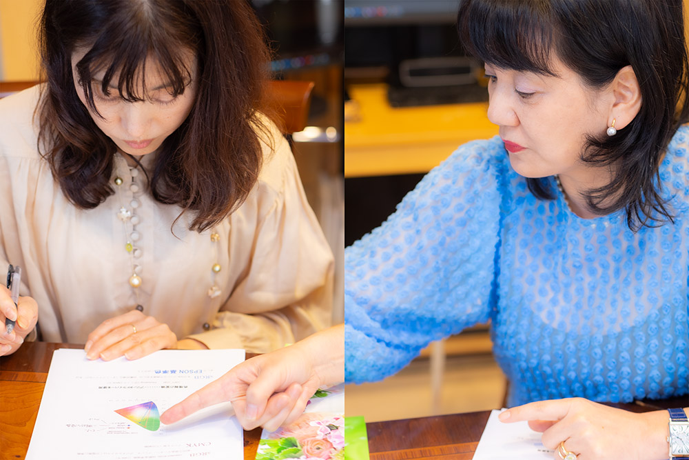 谷津さんはというと、真剣にメモをとりながら今道さんの言葉に耳を傾け、ときには質問をしています。カメラに翻弄されていた前半の姿とは別人のよう。もっとも、谷津さんはカラーコーディネーターの資格をもつ色のスペシャリスト。こういう話はお手のものなのでしょう。