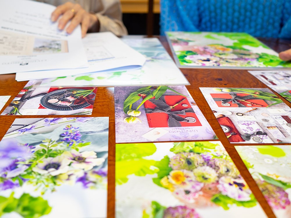 作品を作るプリンターは、CMYKの基本4色にレッドとグレーのインクを搭載した、A3複合機のカラリオ「EP-10VA」です。染料インクのもつ高発色・高精彩な色で花の写真がプリントできます。