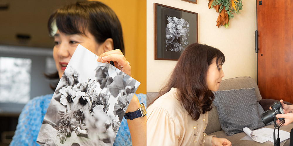 今道:鑑賞するための写真はカラーがいいんだけど、飾ることを思ったらモノクロ。インテリアとしてすごく落ち着くから。飾るためのプリントとして、花であってもモノクロがいいなと思います。飾るとき、絶対こっちのほうが素敵ですよね。カラーは確かにきれいな色なんですけども、けっこう疲れる。色の鮮やかなものって、見ていると疲れるんですよ。