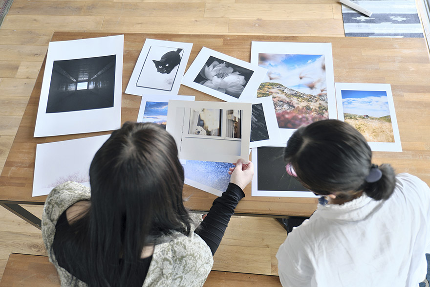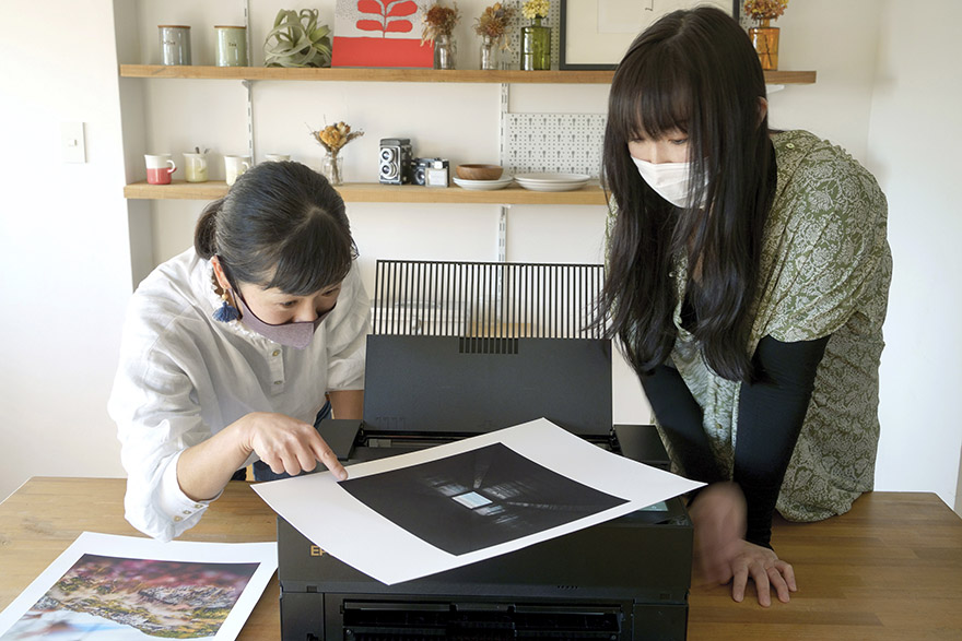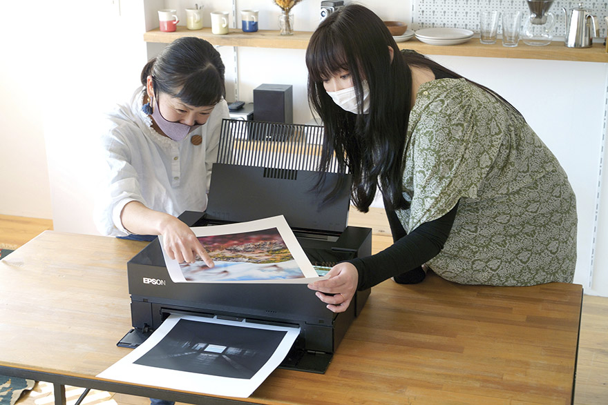 猫や日常のスナップを作品テーマにする金森玲奈さん、山岳や日常を作品テーマにする川野恭子さんをお招きして、作品をプリントしながら、プリントのこだわりや作品について対談していただいきました。制作に使用したプリンターは、A3ノビサイズのプリントに対応するプロ・ハイアマチュア向けのインクジェットプリンター「SC-PX1V」です。(TEXT:加藤マキ子)