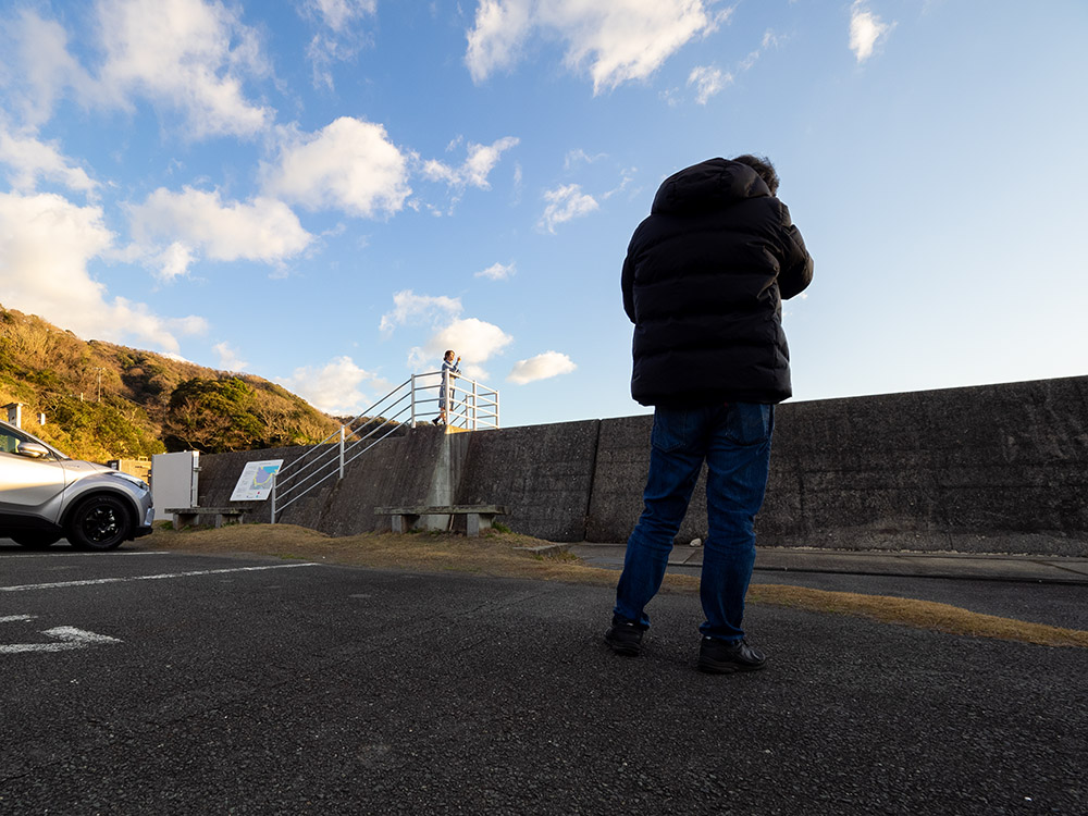 駐車場脇の堤防で望遠レンズを使い撮影。この距離となるとさすがに声を張り上げて指示を出すが、潮騒でユリーカさんが気づかないことも。そんなときは、撮影が停滞しないように次々と指示を変えていく