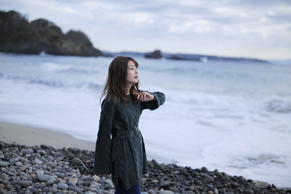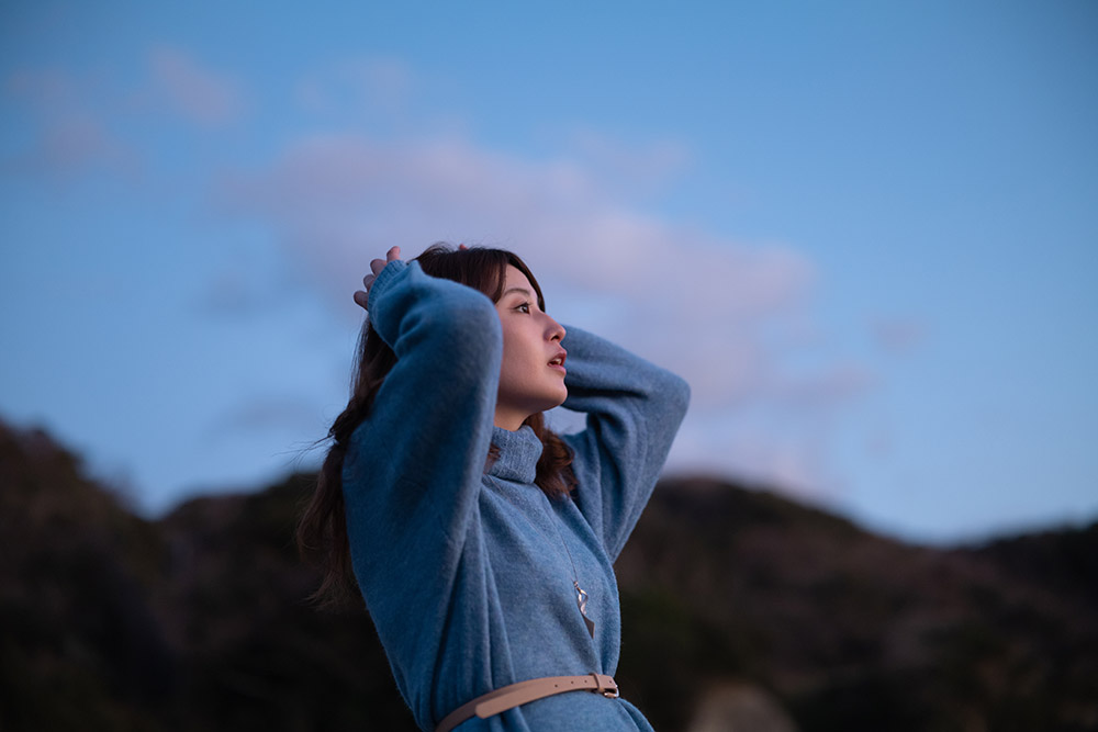 河野:水平線の位置を構図的にいちばんいいところに置くと、モデルの首の付近にくるのよ。首切りみたいなカットになるから、それはダメ。だから、あえて水平線の位置が若干頭の上にくるようにしている。