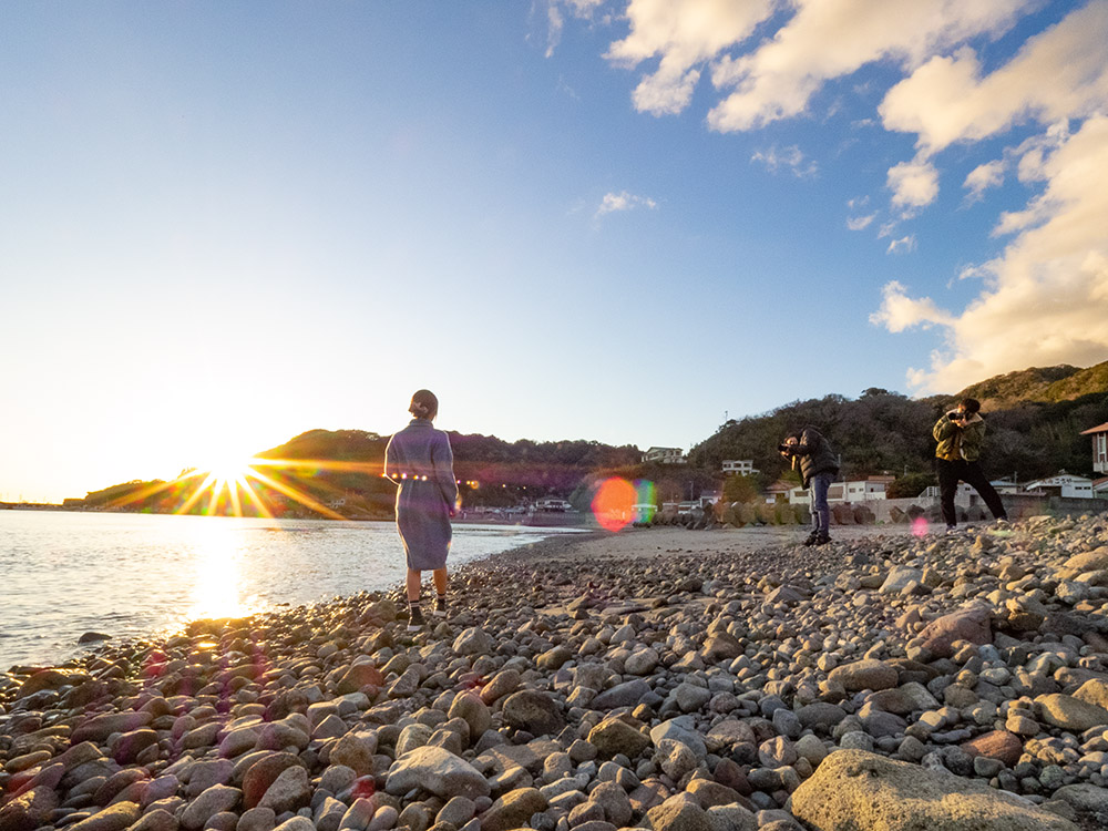 翌朝は、海辺の撮影から始まります。「馴染むための時間」は不要なので、撮る側も撮られる側も、朝イチから全力で臨みます。