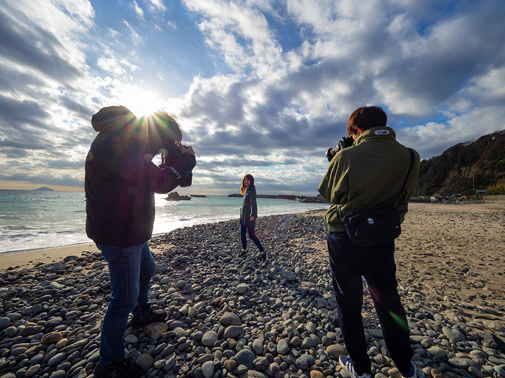 撮影の流れを紹介しておくと、撮影ポイントを決めたら、モデルに立ってもらい、テスト撮影で露出を決めます。ここでイメージするボケや露出にセットできたら、本番はモデルの動きに合わせてシャッターを切るだけ。構図も露出も色も、テスト撮影の段階ですでに決まっているというわけです。