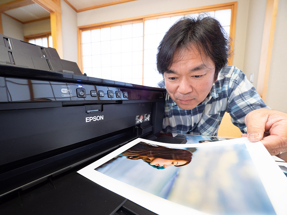 プリンターはエプソン「SC-PX7VII」。CMYKインクのほか、「ブルー」「レッド」「オレンジ」の発色のよいインクを搭載。光沢感を出す「グロスオプティマイザ」インクにより、顔料インク系のプリンターながら、高光沢で高精彩なプリントが得意。プリント用紙は「写真用紙クリスピア<高光沢>」を使用