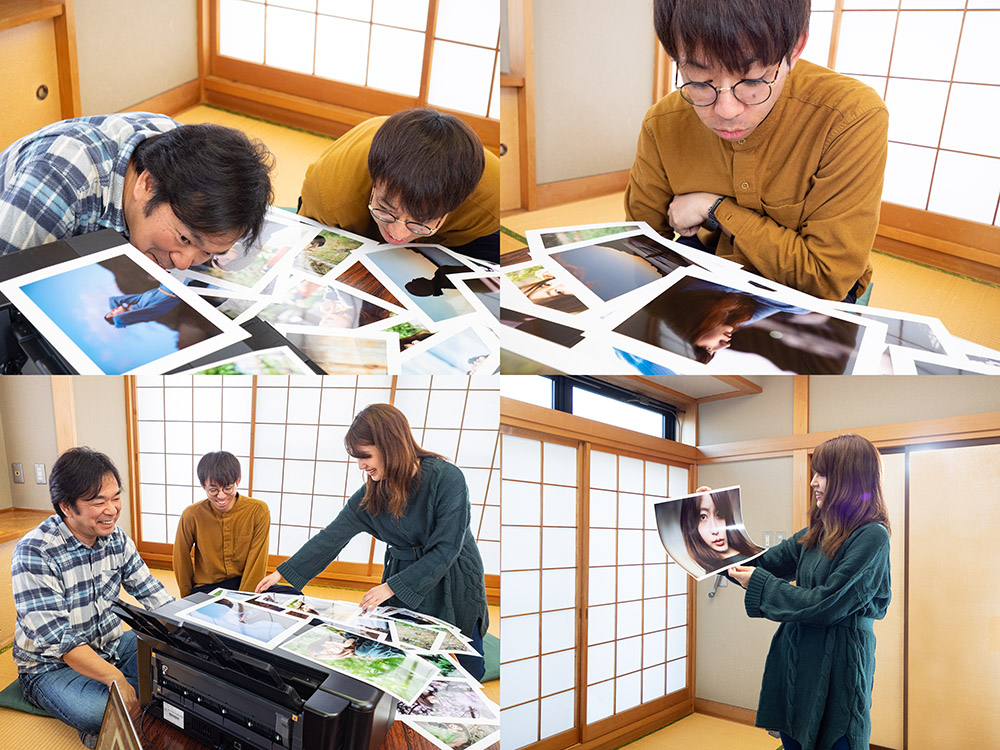 いつの間にかユリーカさんもプリントの前に集まり、写真談義が始まりました。撮影の現場でもカメラのモニターで写真を確認していたし、セレクトの際もパソコンの画面で写真を見ていた3人ですが、「プリント」と「データ」とでは気持ちの入り方が異なる様子。