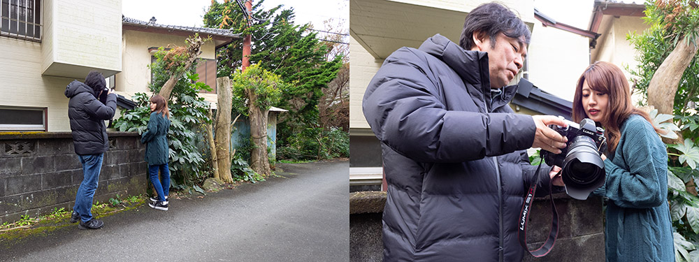 上の写真の撮影現場は、「ここで撮るの?」と思うような普通の道端。ユリーカさんも少々戸惑い気味だったのか、河野さんは写真を見せて作画意図を伝え、作品性を高めていく