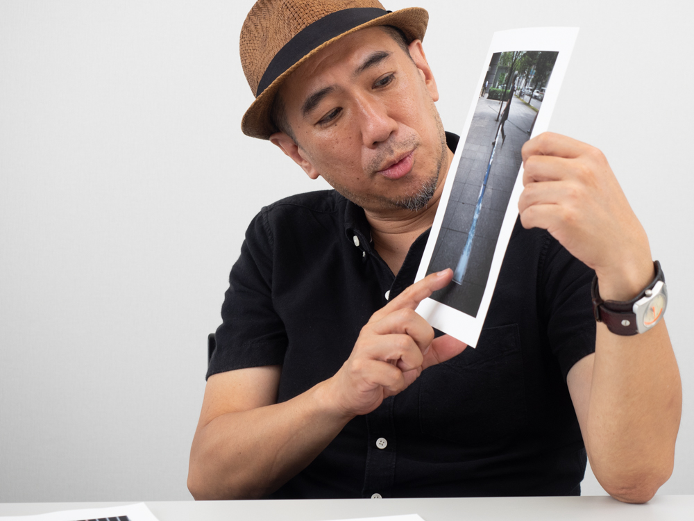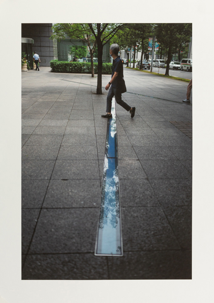 熊切: 地面にほんのわずかな隙間というかね、反射があって。木の映り込みがきれいだなって見ていて。そしたら、「あれ? みんなまたいでいくよな」って。その隙間を、“ピョン”というわけじゃないけど、ひとが渡ってく。その瞬間を写したもの。この細いところに(景色が反射して)写ると、ちょっとドラマになるでしょ。