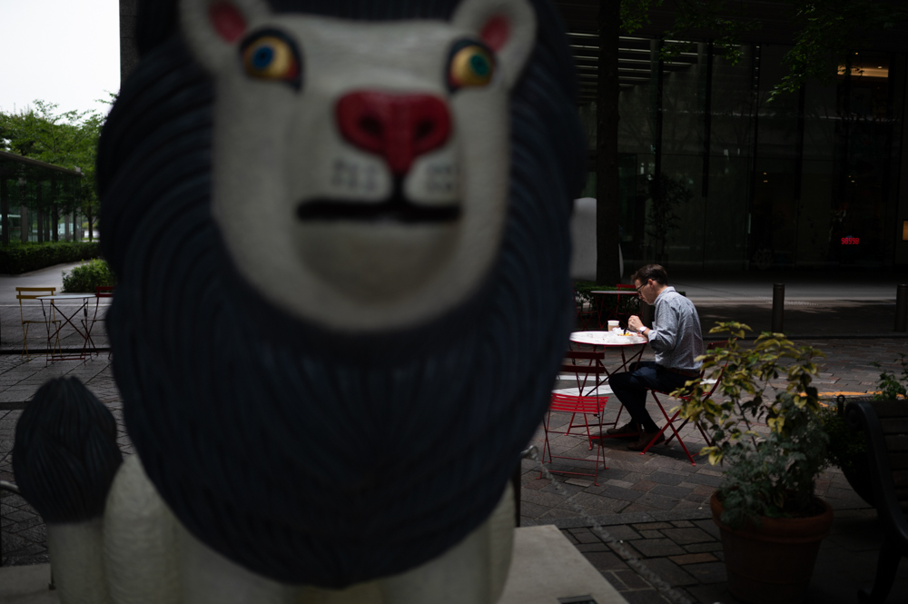 熊切さんの説く、「街スナップは反射を活かす」という考えが分かりやすい作品があります。オフィス街での1カットです。