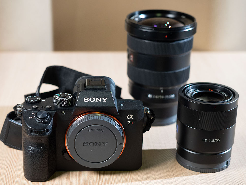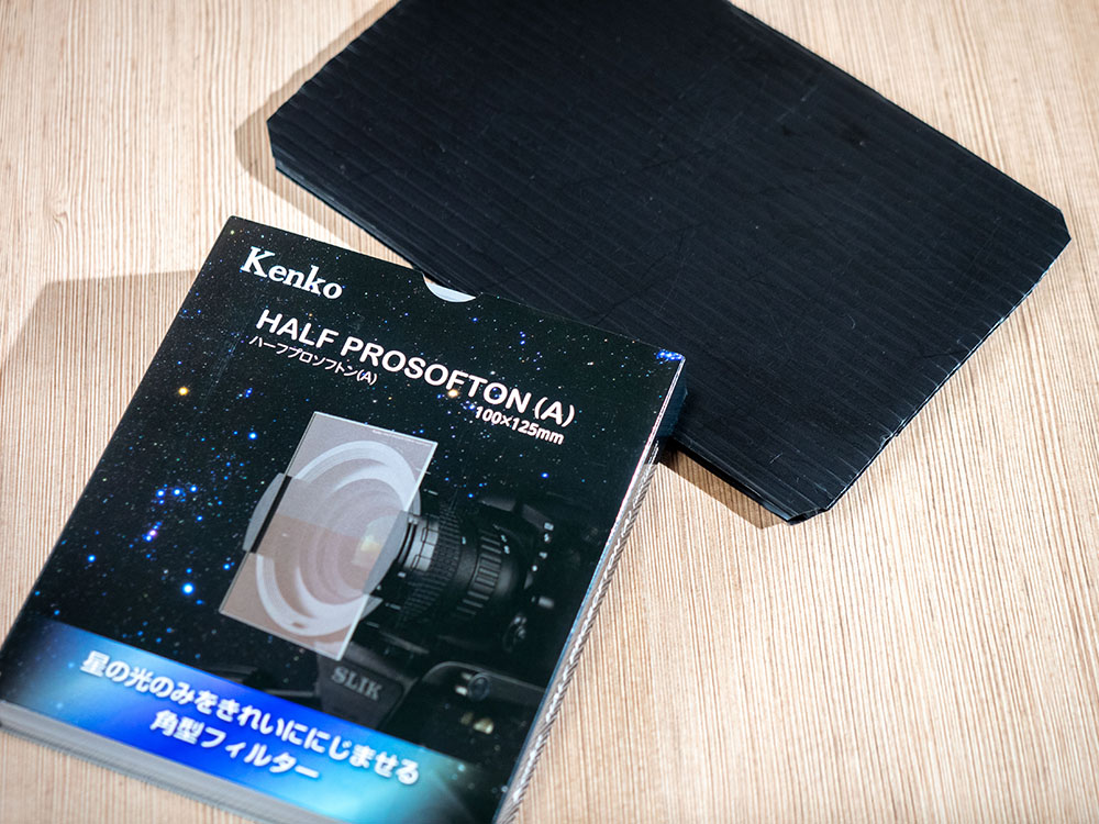 茂手木さんの当日の撮影機材。カメラはソニーの「α7R III」、レンズは、同「FE 16-35mm F2.8 GM」のズームレンズと、明るい単焦点の「Sonnar T* FE 55mm F1.8 ZA」を使用。そのほか、ソフトフォーカス効果で星を大きく写すための、ケンコー「ハーフプロソフトン(A)」フィルターと、覆い焼きを行うための黒いプラ段ボールも星景夜景の撮影では必要な機材。