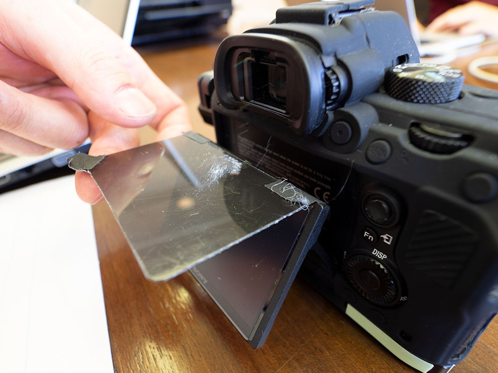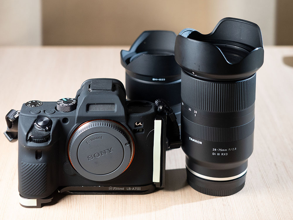 西田さんの撮影機材。カメラはソニーの「α7 III」。本体を保護するシリコンカバーに、アルカスイスタイプのL型ブラケットを装備。夜に見ると明る過ぎる液晶画面には、下敷きを切って作った自作の「減光フィルター」を装着している。使用していたレンズは、タムロン「28-75mm F/2.8 Di III RXD」とトキナー「FíRIN 20mm F2 FE AF」の2本。