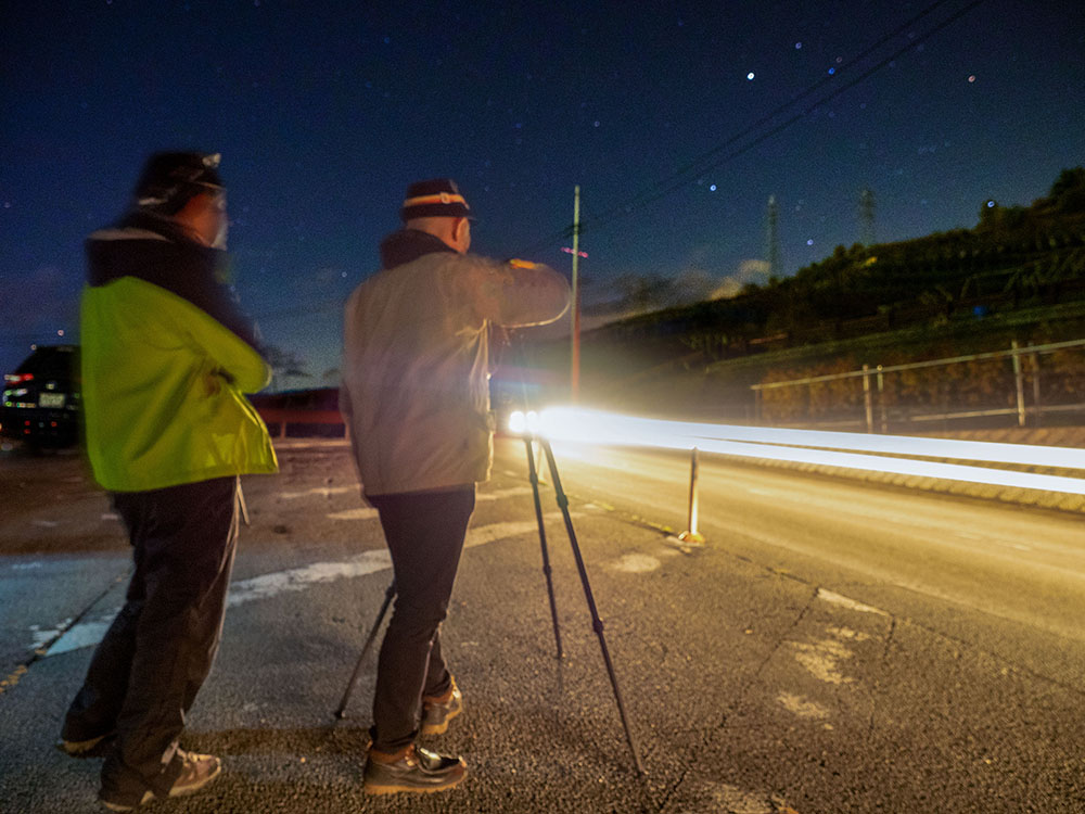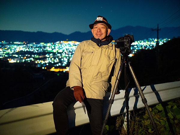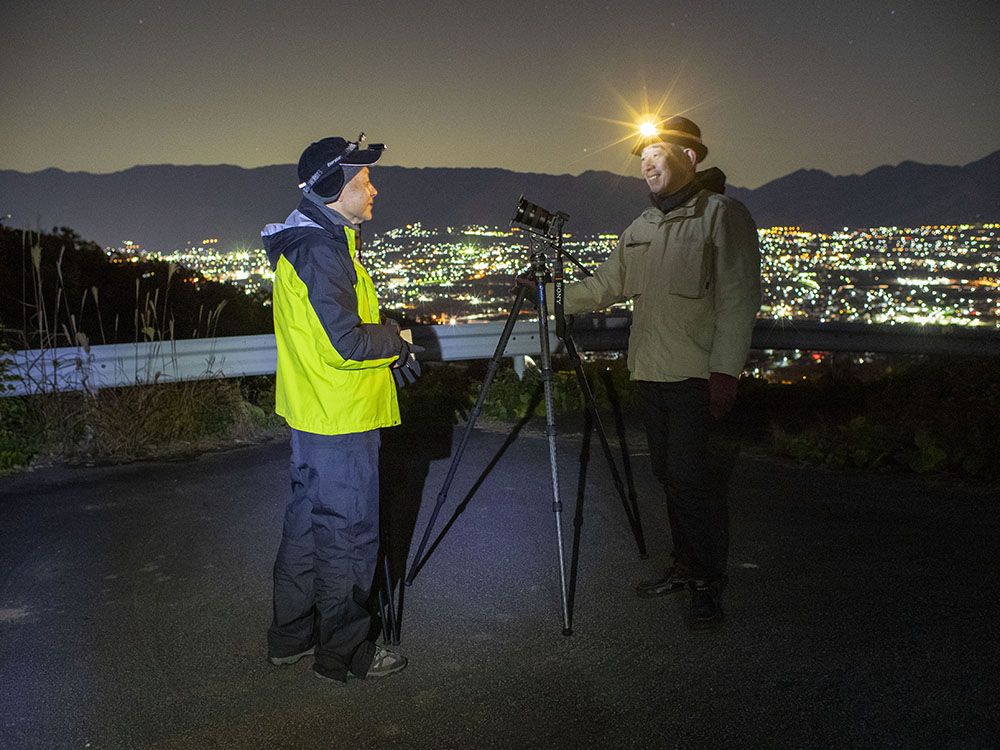 絶景の星空には興味がないと語る茂手木さん。事実、最初に車を止めた撮影ポイントは、道路わきの小さな駐車スペースです。雲も少なく眼下に街の夜景がきれいに見えますが、星がよく見える絶景のスポットかというと……。街の灯りがあるためか、星はあまりよく見えません。そんな場所で、撮影はスタートしました。