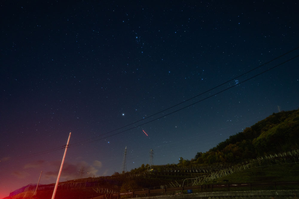 写真を撮る、作品を作るにあたって、茂手木さんは撮影のテクニックよりも先にストーリー性を教えてくれました。茂手木さんの話を聞くと、星景夜景は面白そうと感じます。撮ってみたいと思いはじめます。茂手木さんは撮影の現場で、「こういうものを取り入れるといいんだよ」と、電線だとか、ガードレールだとか、ときには自動販売機だとか、そんな“邪魔者”を指さします。しかも、光を当てて、あえてその存在を目立たせるようなことも。
