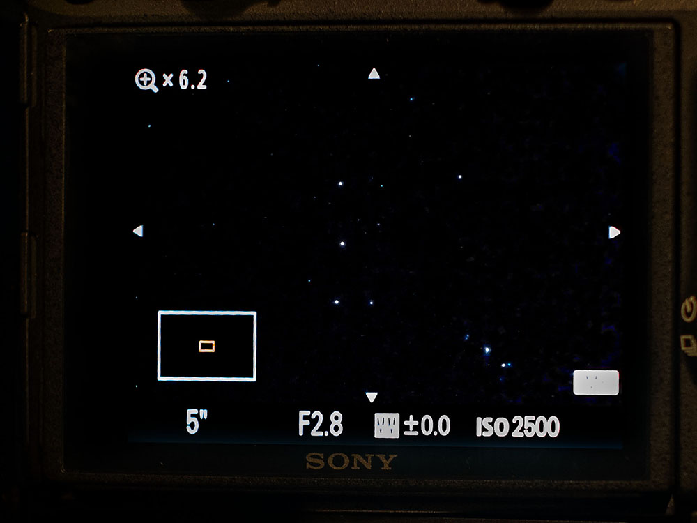 ライブビュー画面で拡大してピントを合わせる。暗い場所で、手探りでカメラのボタンを操作するのは難しいので、あらかじめライブビューを拡大する操作は覚えておきたい。また、星空など暗所での撮影時のフレーミング確認時に、αのブライトモニタリング機能というものがあることも覚えておきたい。これは、通常のライブビューでは暗くて構図を決められないシーンでもカメラ側でゲインアップして明るく画面に写しだすという機能になり重宝する。